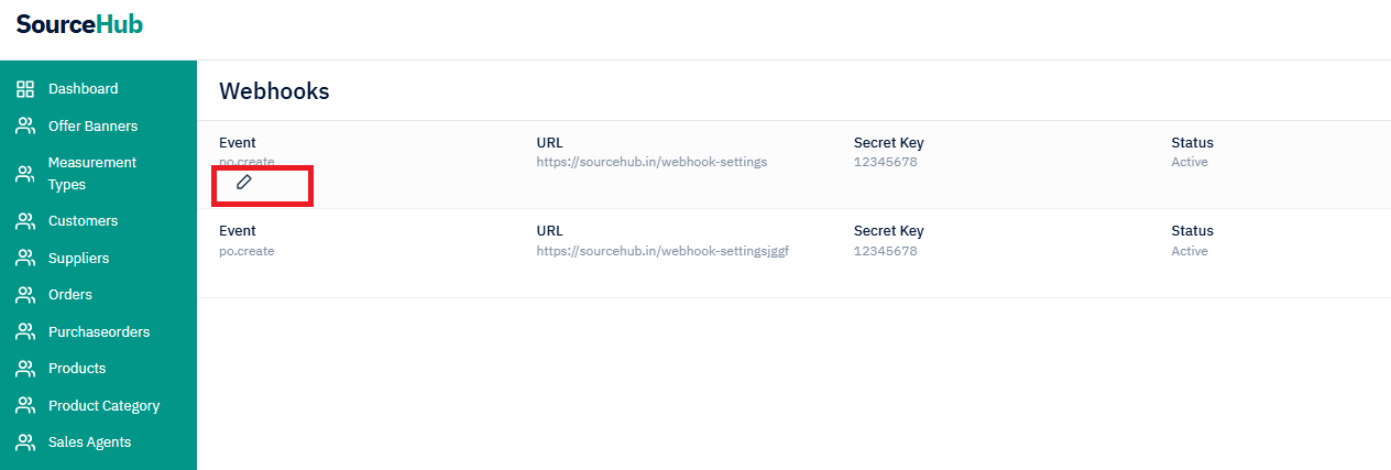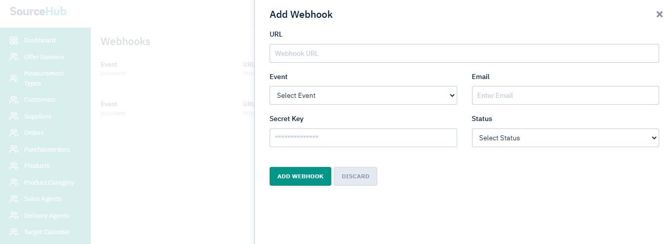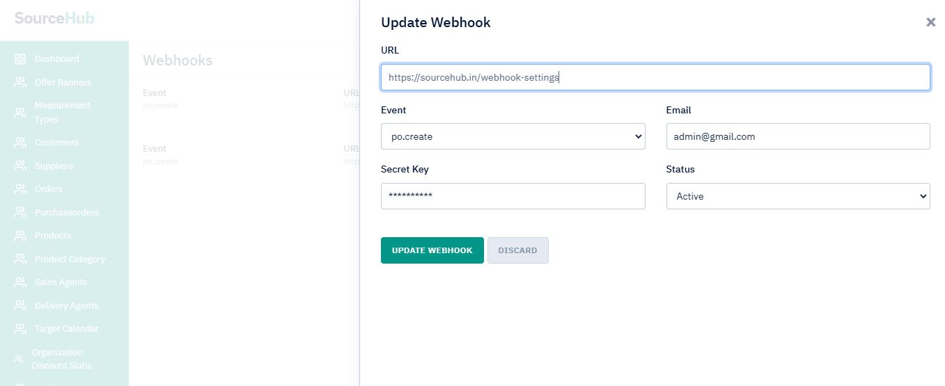 - Enter a Webhook Secret Key for the webhook endpoint. The secret is used to validate that the webhook is from Sourcehub. Do not expose the secret publicly.